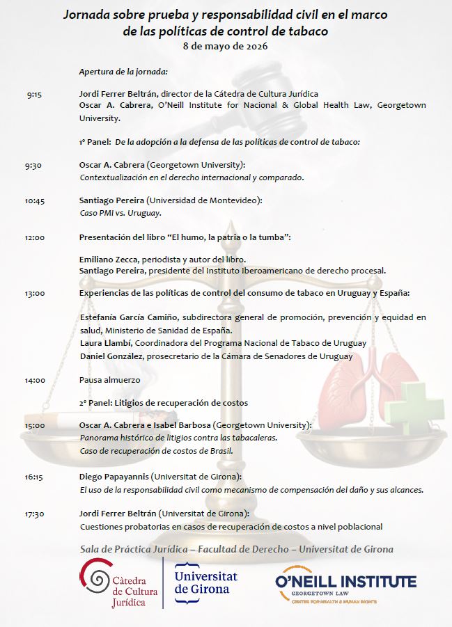 El control del tabac és un exemple paradigmàtic de la intersecció entre dret, salut i activitat empresarial, atès l’impacte del tabaquisme com a factor de risc principal de malalties cròniques i causa de milions de morts anuals. En les darreres dècades, les polítiques públiques han avançat notablement gràcies a l’ús d’eines jurídiques com regulacions sobre l’etiquetatge, la publicitat o la fiscalitat, consolidant estàndards de salut i drets humans. Tot i això, aquestes polítiques han estat objecte de controvèrsia i litigis, destacant casos com Philip Morris v. Uruguai, que va reafirmar la capacitat dels estats per protegir la salut pública. Paral·lelament, ha crescut l’ús del litigi per part dels estats per recuperar els costos sanitaris associats al tabaquisme, com exemplifica el cas recent del Brasil. En aquest marc, la jornada proposa analitzar el paper del dret tant en el disseny i defensa de polítiques de control del tabac com en la responsabilitat civil per la recuperació de costos, amb una mirada comparada sobre els seus límits i oportunitats.